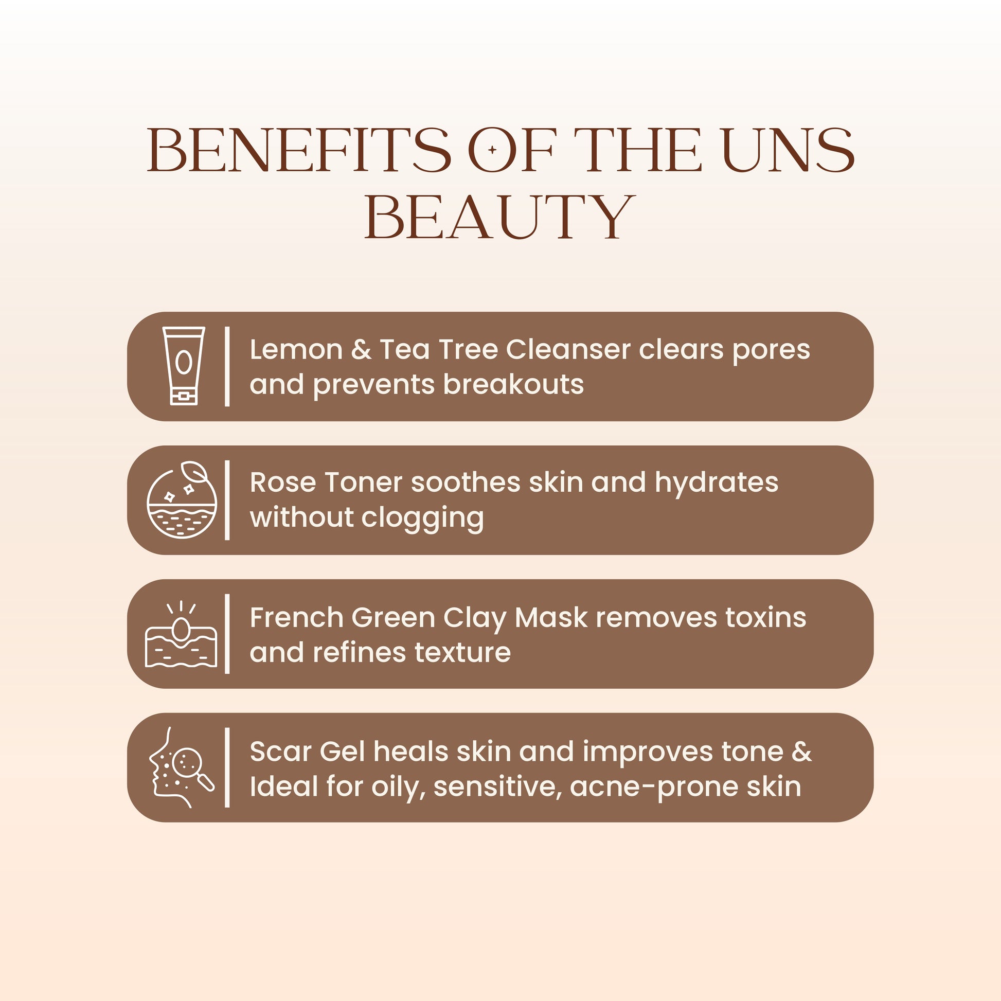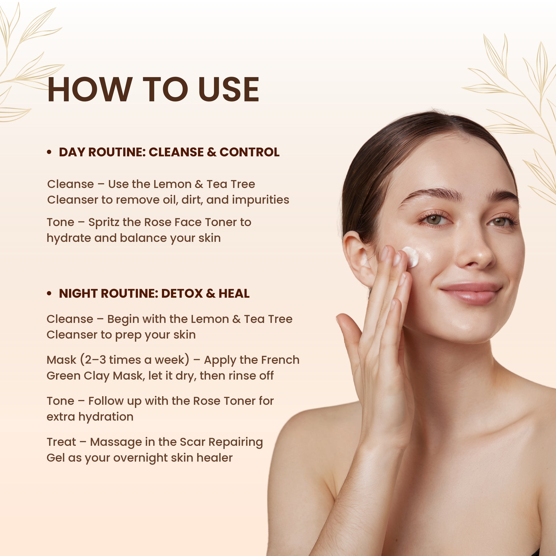Struggling with oily skin and stubborn pigmentation? Meet the ClearTone Pigmentation Combo — a complete skin-clearing ritual designed to control excess oil, soothe inflamed skin, and visibly fade pigmentation, scars, and dark spots. Infused with Lemon, Tea Tree, Rose, French Green Clay, and scar-healing botanicals, this 4-step combo detoxifies, hydrates, and repairs to give you smooth, clear, and even-toned skin over time.