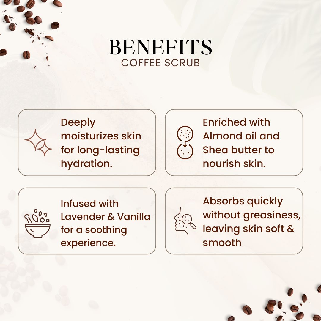Indulge in the ultimate pampering experience with our Coffee Body Scrub, crafted from the finest natural ingredients. Let the rich aroma of freshly ground coffee beans awaken your senses as it gently exfoliates, leaving your skin feeling rejuvenated and silky smooth. Infused with nourishing oils, this luxurious scrub buffs away dryness and reveals radiant, glowing skin. Elevate your skincare routine and embrace the revitalizing power of nature with every use.